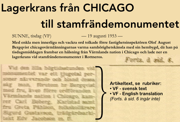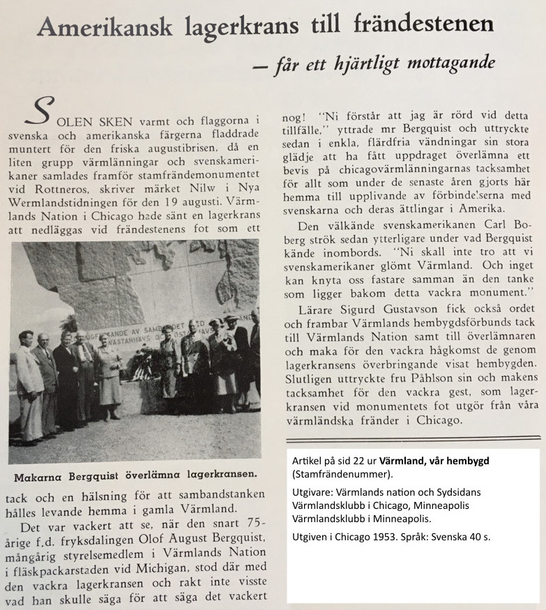 Med enkla men innerliga och vackra ord tolkade förre fastighetsinspektören Olof August Bergqvist chicagovärmlänningarnas varma samhörighetskänsla med sin hembygd, då han på tisdagsmiddagen frambar en hälsning från Värmlands nation i Chicago och lade ner en lagerkrans vid stamfrändemonumentet i Rottneros.
