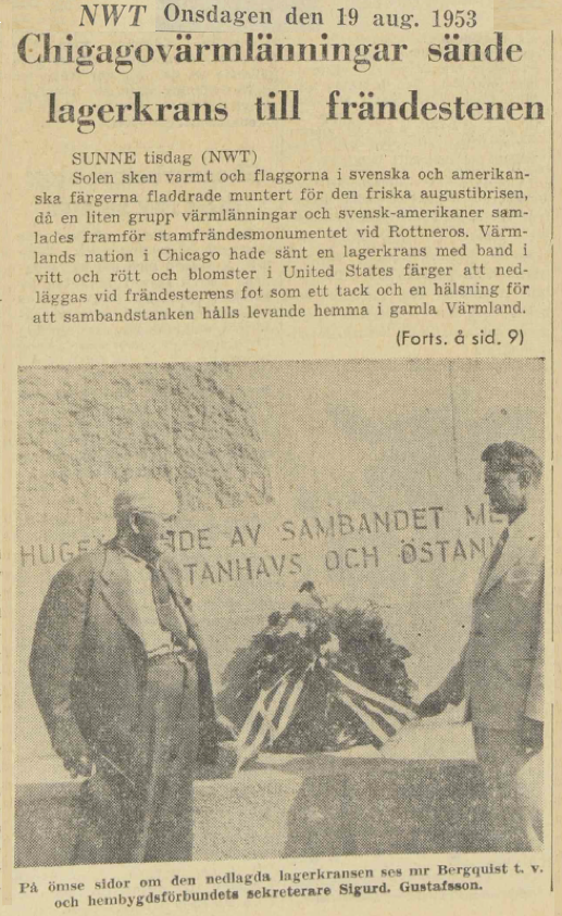 The sun is hot and the flags of Swedish and American colors fluttered cheerfully in the fresh August breeze, when a small group of Varmlanders and Swedish Americans gathered in front of the Kinsmen Monument at Rottneros, according to the Nilw signature in Nya Wermlandstidningen1) for August 19th. The Värmland Nation in Chicago had sent a laurel wreath to be laid down at the bottom of the monument as a thank you and a greeting for the collaboration mentality being kept alive at home in Old Värmland.