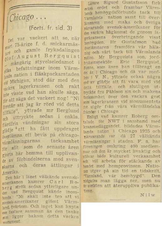 — Det är ett glädjande uppdrag som jag anförtrotts, förklarade han, då han placerade den stora lagerkransen med blommor och band i de amerikanska färgerna vid monumentets fot. Talaren frambar i fortsättningen ett tack till makarna Påhlsson och till Värmlands hembygdsförbund för resandet av det storslagna monumentet. Hr Boberg, som var nästa talare, konstaterade att värmlänningarna i Chicago ingalunda har glömt sin hembygd. Vänskapsbanden har i stället knutits allt fastare och ingenting kan understryka samhörighetskänslan på ett bättre sätt än detta monument framhöll talaren, som vidare poängterade att värmlänningarna och svenskarna i allmänhet gjort god propaganda för sin bygd och sitt land i Amerika.