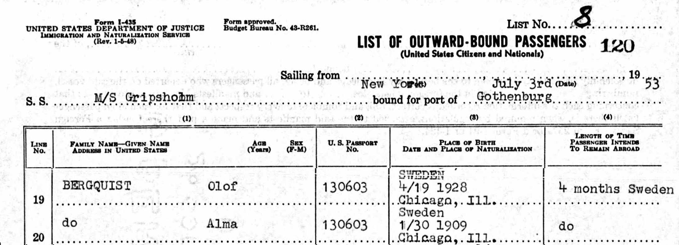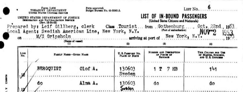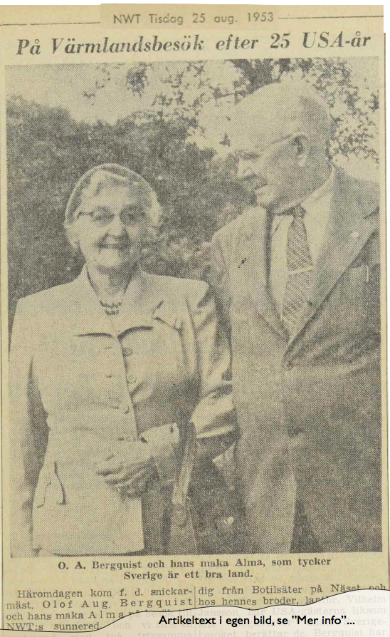 Om du har mer eller annan information om Olof Augusts och Almas hemresa 1953, är du ytterst välkommen att ge ett tips! Se e-post nedan. Om du har kommit till den här sidan från en länk på sidan Olof Augusts liv i Chicago, och vill fortsätta läsa där, klicka på länken 1954 . Annars gå till start på den sidan .