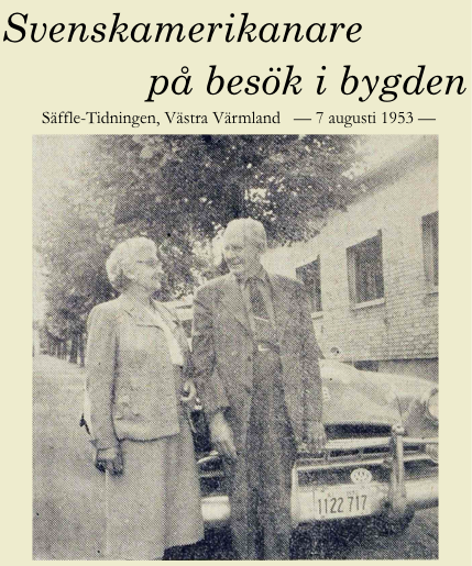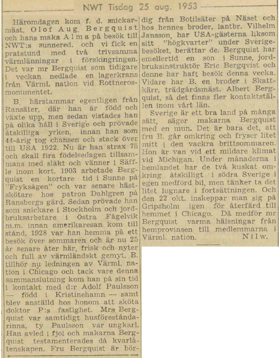 B. comes actually from Ransäter, where he was born and grew up, then he resided in many parts of Sweden och tried a lot of jobs, before he as 44 year old took a chance to buzz off to USA 1922. Now he is soon 75 and will not before long celebrate his birthday together with relatives and friends in Säffle. 1903 Bergquist worked for a short while in Sunne at the "Fryksågen"3) and later became horse minder at patron Dahlgren's on Ransbergs farm. The he tried out as carpenter in Stockholm and farm worker in Östra Fågelvik etc. before he left for America. 1928 he was home for a summer visit and is now 25 years later back, healthy and merry and full of värmländsk2b) good nature. B. now is part of the leadership for Värmlands Nation in Chicago and thanks to this association he got in contact with Dr. Paulsson — born in Kristinehamn — and was employed by him as houseman to attend to Dr. P's property. Mrs. Bergquist at the same period was housekeeper, as Paulson was a bachelor. When he passed away last year the Bergquist spouses were in his will given the property. Mrs. Bergquist is born in Botilsäter on "Näset"3, at her brother's, the farmer Vilhelm Jansson, the USA guests have set up their "headquarter" during their Sweden visit, they narrated. Bergquist however has a son in Sunne, agricultural instructor Eric Bergquist whom they have been visiting this week. Furthermore B. has a brother in Skattkärr, gardener Albert Bergquist, so there are several contact points in our province.