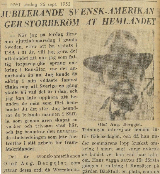 It is the Swedish-American Olof Aug. Bergquist who expresses these words, when Wermlands-Tidningen1) interviews him before the birthday, and as he during the summer has been gadding about in almost every corner of the country, he knows what he is talking about. His cradle was rolled for the first time in Ransäter om the farm Bäckfall, a place, that then was far from all "honor and reason", but can today be frequented even with the "yankees" dashing Dodge. As a crofter's boy he had early to learn to be self-reliant. Efter marriage the family settled at Hösserud, but when his wife died, he did not think there was much that tied him to Sweden.