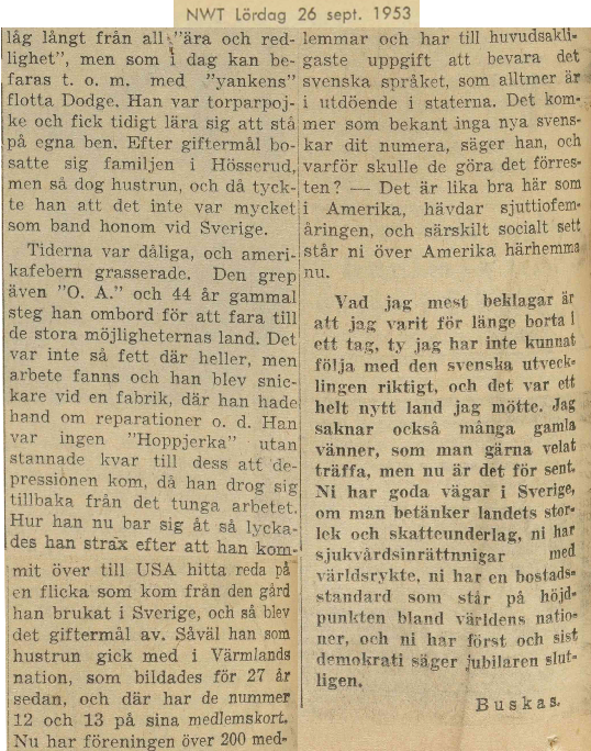 Times were bad, and the America fever was raging. It also captured O.A. and 44 years old, he boarded to go to the land of great opportunities. It was not that fat there either, but work was possible to have so he became carpenter at a factory, where he was responsible for repairs etc. He was not a "hoppjerka"2) so he stayed until the depression, then he widthdrew from hard labor. How he behaved he succeeded, short after his arrival to USA, to find out a girl who came from the farm he cultivated in Sweden, and so marriage came off. As well he as his wife joined Värmlands nation, which was formed 27 years ago, in this association they have number 12 and 13 on their membership cards. Now the association have more than 200 members with its main task of preserving the Swedish langauge, which is increasingly dying out in the states. As is known, no new Swedes are coming there nowadays, he says, and why should they do that by the way? — It is as good here as in America, claims the seventy-five year old, and especially socially speaking you are here at home unrivalled by America nowadays.