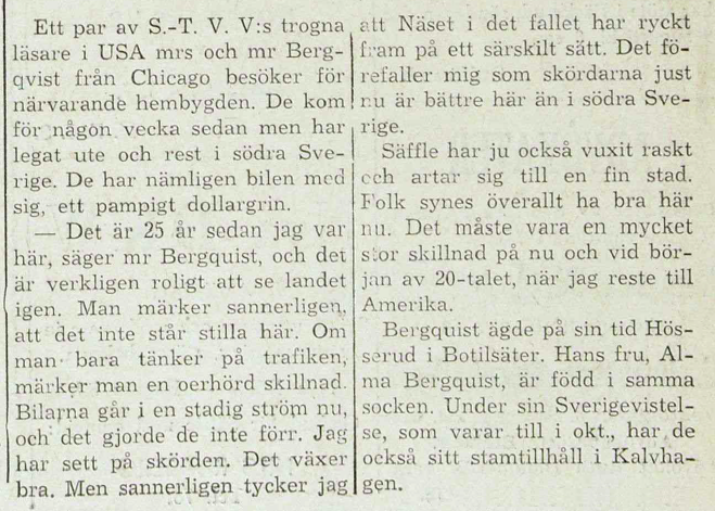 Ett par av S-T VV:s trogna läsare i USA mrs och mr Bergqvist från Chicago besöker för närvarande hembygden. De kom för någon vecka sedan men har legat ute och rest i södra Sverige. De har nämligen bilen med sig, ett pampigt dollargrin.